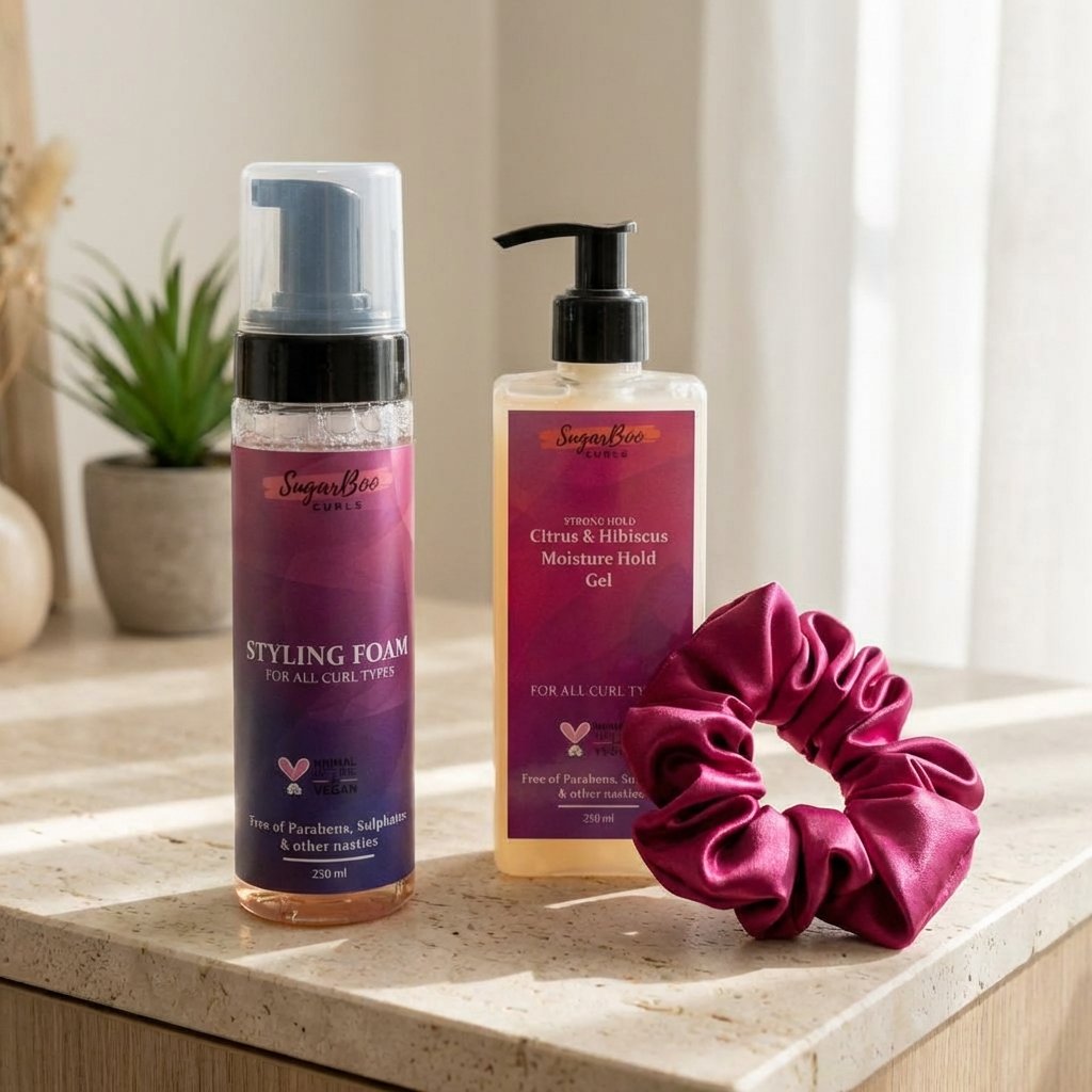 SugarBoo Curls combo - stylingová pěna & gel s rubínovou scrunchie vel. IV